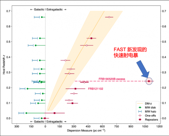 从色散-红移关系上清晰可见FRB 20190520B拥有最大的宿主星系电子密度。(中国科学院国家天文台供图)