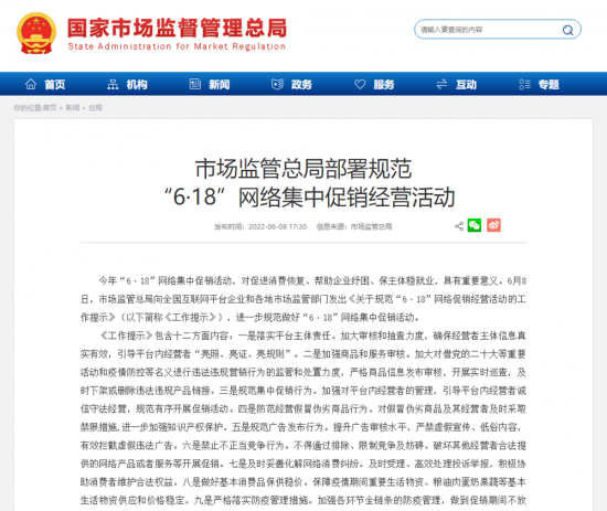 市场监管总局8日向全国互联网平台企业和各地市场监管部门发出《关于规范“6·18”网络促销经营活动的工作提示》,进一步规范做好“6·18”网络集中促销活动,助力中小微商户纾困。