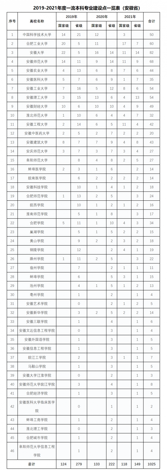安徽商报讯 (安徽商报融媒体记者 刘媛媛) 教育部近日公布了2021年度国家和省级一流本科专业建设点名单,我省44所省属本科高校共240个专业(其中国家级98个,省级142个)成功入选。截至目前,我省44所省属本科高校共入选国家级一流本科专业建设点298个、省级一流本科专业建设点617个,省属本科高校一流本科专业点建设实现了全覆盖,入选国家级一流本科专业点总数较全国平均233个高出65个。