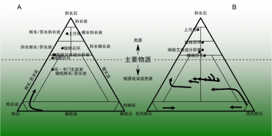 以往对南极-艾肯盆地物质成分的研究大多只注重镁铁质矿物,由于这一地区的镁铁质异常特征,甚至引发了有关月幔是橄榄岩还是辉石岩的争论。虽然根据月球岩浆洋假说,橄榄石和辉石是月幔的主要矿物,但是月壳形成之后的深成岩浆侵入作用同样能够在月壳中形成富集橄榄石或辉石的岩石,因此富集橄榄石或辉石并不能作为源自月幔的证据。迄今人类还没有获取南极-艾肯盆地的样品返回地球,无法获知其微量元素和同位素特征,通过遥感或原位探测可获得的物质成分信息中,斜长石含量也是区分壳源和幔源岩石的关键指标。
