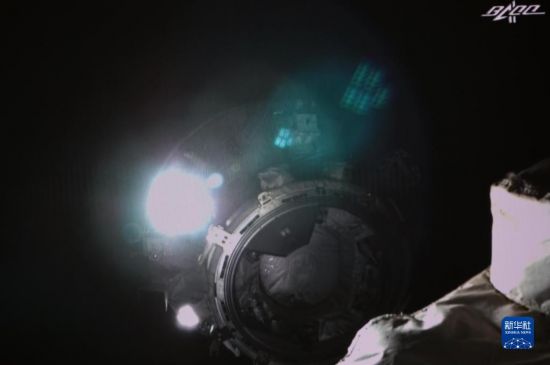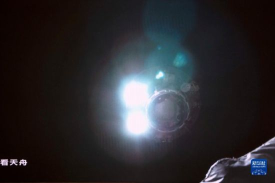 7月17日在北京航天飞行控制中心拍摄的天舟三号货运飞船撤离空间站组合体图像。这是天舟三号货运飞船正在向200米停泊点撤离。新华社记者 郭中正 摄