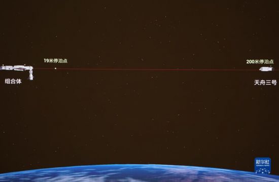 7月17日在北京航天飞行控制中心拍摄的天舟三号货运飞船撤离空间站组合体图像。这是天舟三号货运飞船撤离至200米停泊点的模拟图像。新华社记者 郭中正 摄