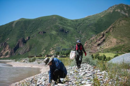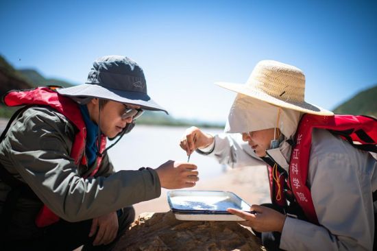 7月24日,长江科学院科考队员李鲁丹(右)与刘晗在澜沧江源区的扎曲采集底栖动物样本。新华社记者 肖艺九 摄
