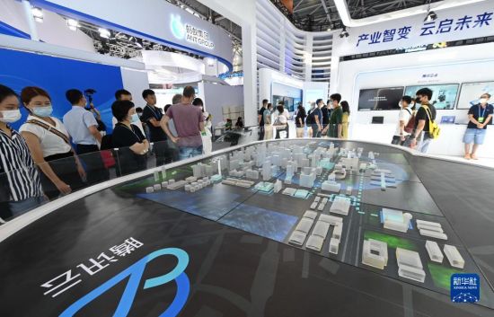 观众在第五届数字中国建设成果展览会上参观腾讯云全栈解决方案沙盘(7月23日摄)。新华社记者 林善传 摄