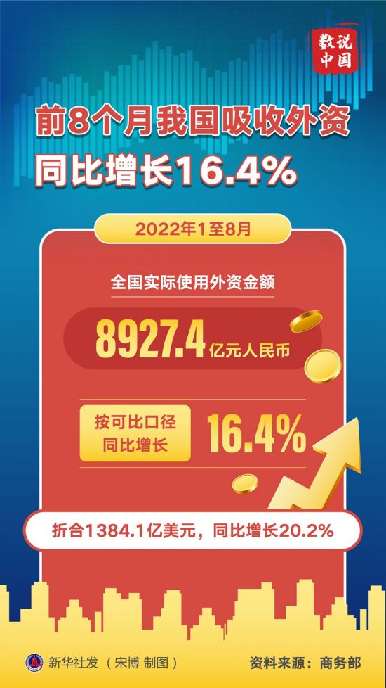 新华社北京9月19日电(记者谢希瑶)记者19日从商务部获悉,2022年1至8月,全国实际使用外资金额8927.4亿元人民币,按可比口径同比增长16.4%(下同),折合1384.1亿美元,同比增长20.2%。