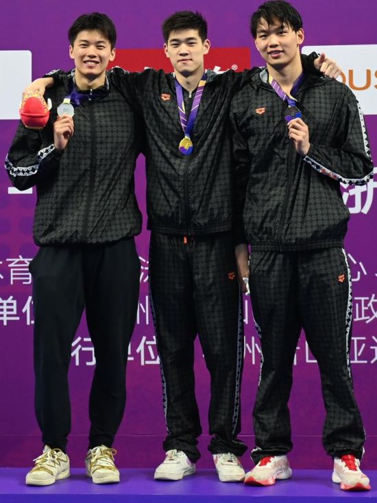 5月4日,获得男子200米自由泳前三名的浙江队选手潘展乐(中)、汪顺(左)和洪金权在颁奖仪式上合影。新华社记者黄宗治摄