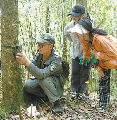 四川大相岭大熊猫野化放归研究基地巡护员在安装调试红外线相机。杨爱玲摄