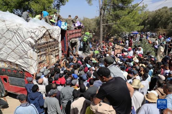 9月11日,救援人员在摩洛哥马拉喀什南部的艾米兹米兹村分发救灾物资。新华社记者王东震摄