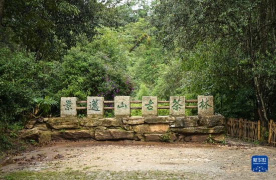 在景迈大寨古茶林入口处矗立有“景迈山古茶林”字样的标识(8月29日摄)。新华社记者 李贺 摄