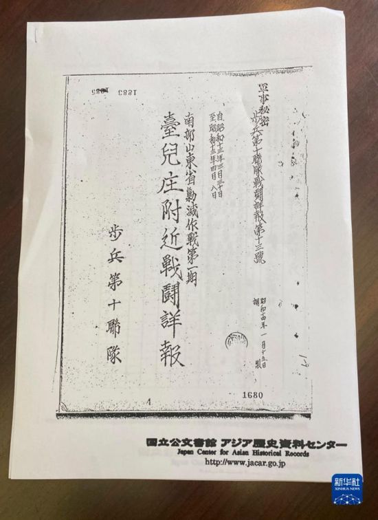 这是10月12日在日本东京拍摄的日本毒气战研究专家、日本明治学院大学国际和平研究所研究员松野诚也找到的台儿庄战役相关《战斗详报》。新华社记者 郭丹 摄