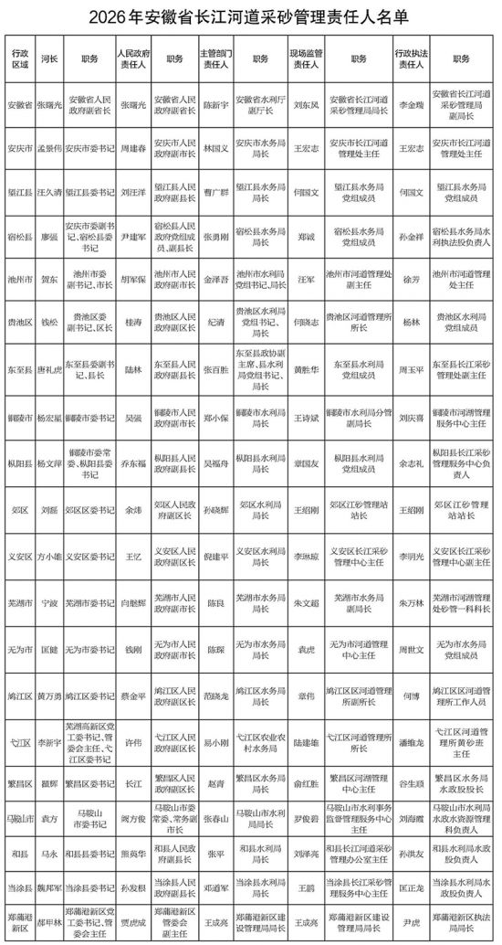 为加强长江河道采砂管理,有效落实长江采砂管理责任制,安徽省明确了2026年采砂管理省、市、县三级河长,人民政府行政首长责任人、水行政主管部门责任人、采砂现场监管责任人和水行政执法责任人名单,特向社会公告。(记者 汤超)